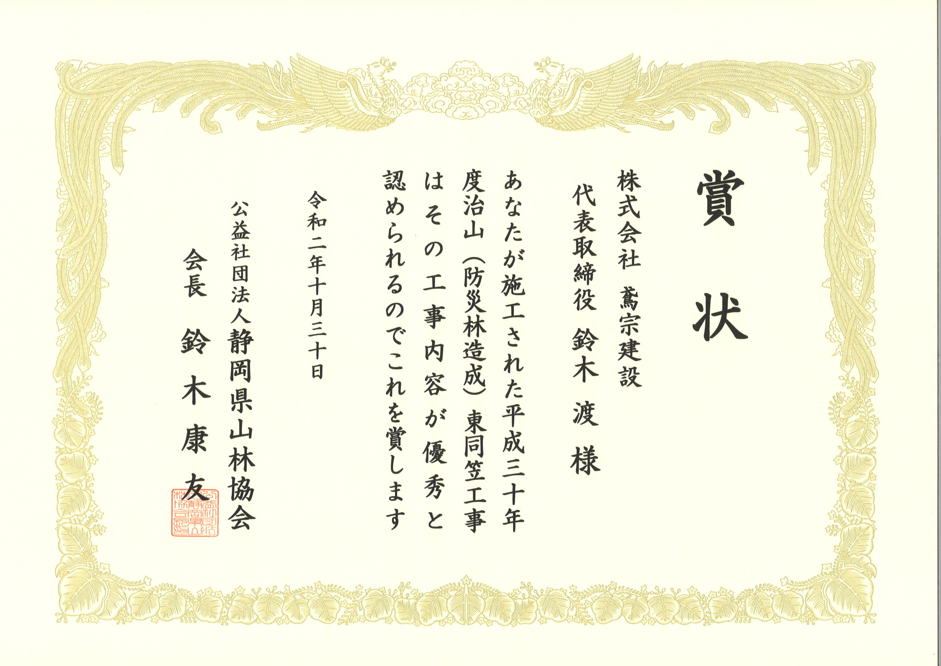 静岡県中遠農林事務所より優良建設工事表彰(優良…