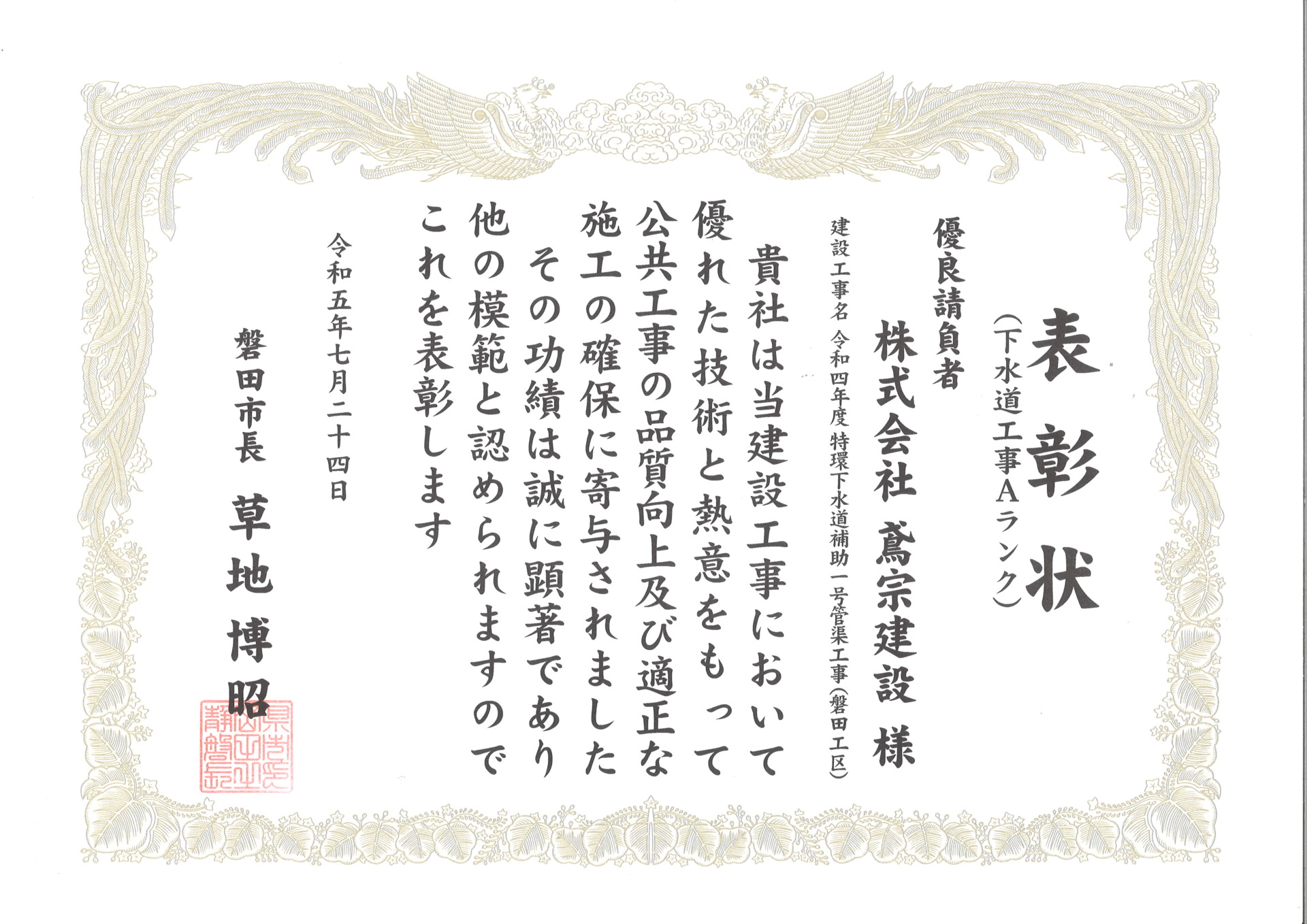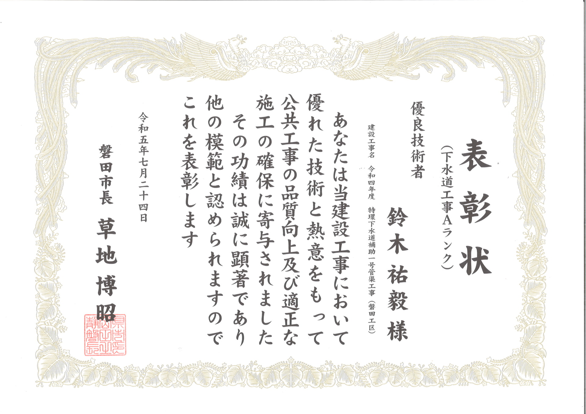 磐田市より下水道工事優良工事表彰を受賞致しました