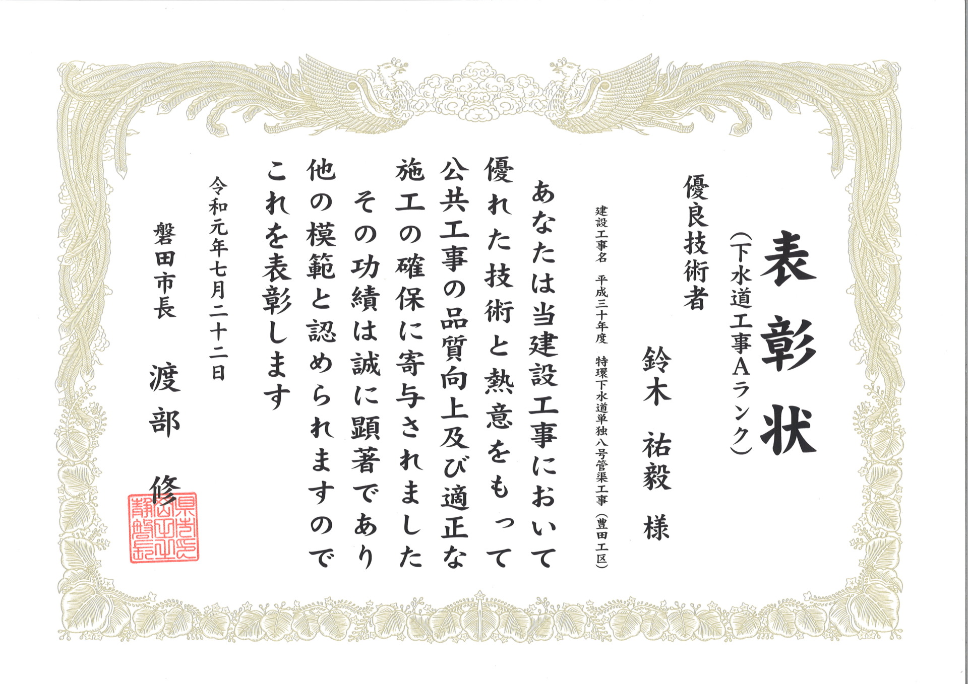 磐田市より下水道工事優良工事表彰を受賞致しまし…