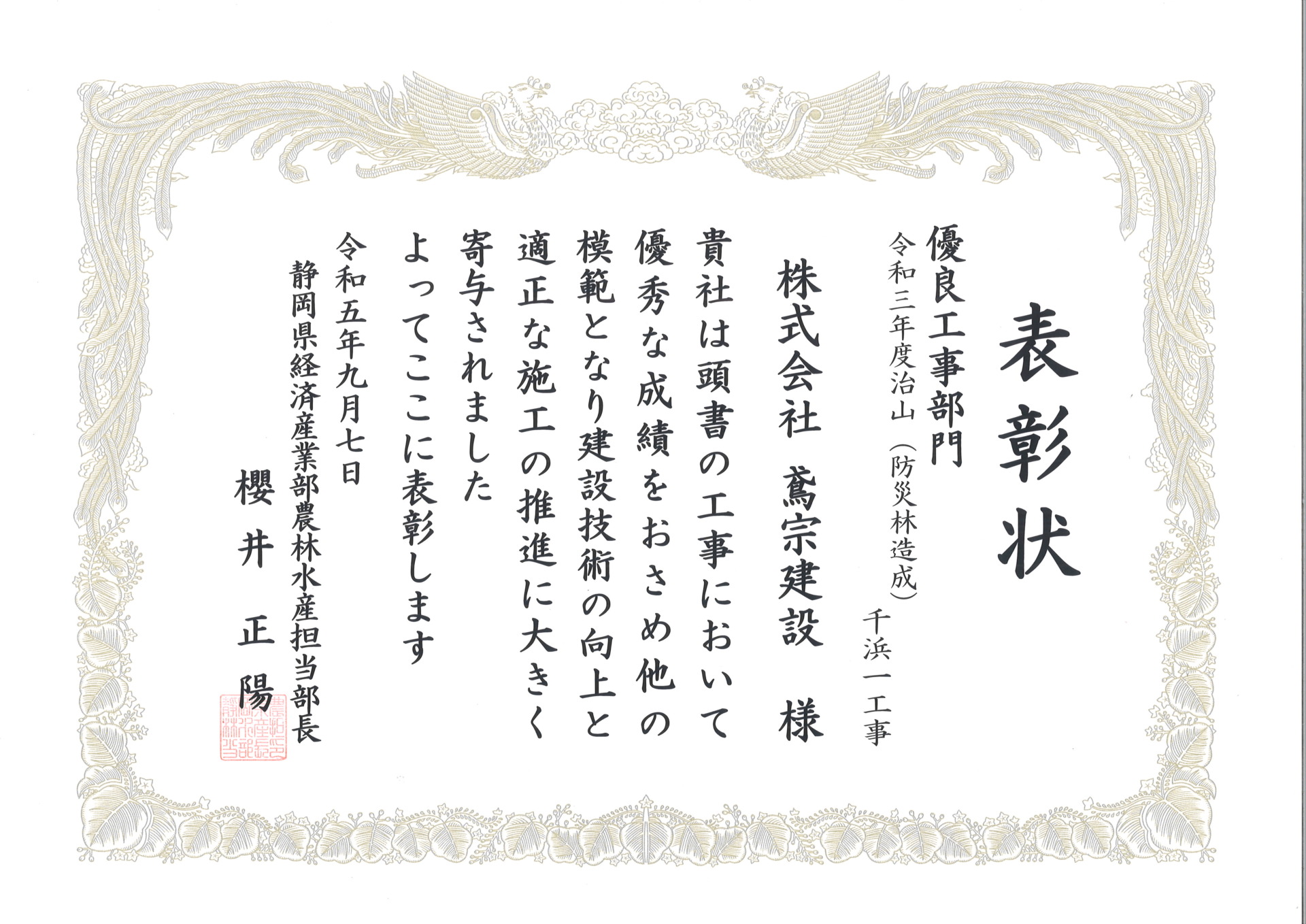 静岡県経済産業部農林水産担当部長より優良建設工事表彰(優良工事)を受賞致しました