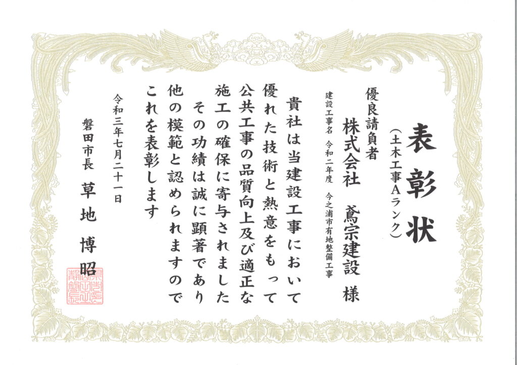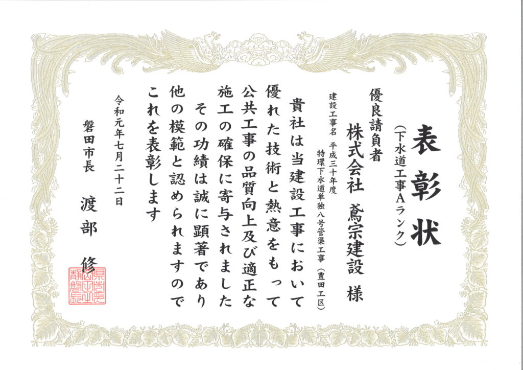 磐田市より下水道工事優良工事表彰を受賞致しました