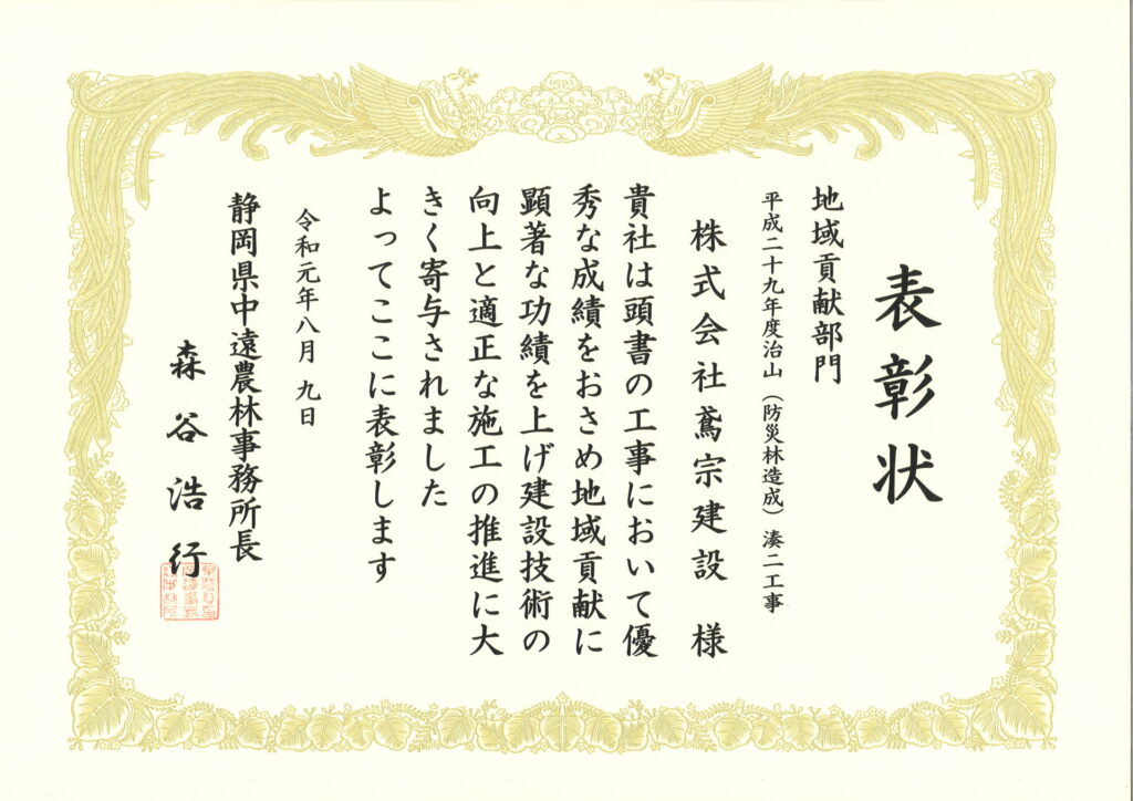 静岡県中遠農林事務所より優良建設工事表彰(地域貢献)…