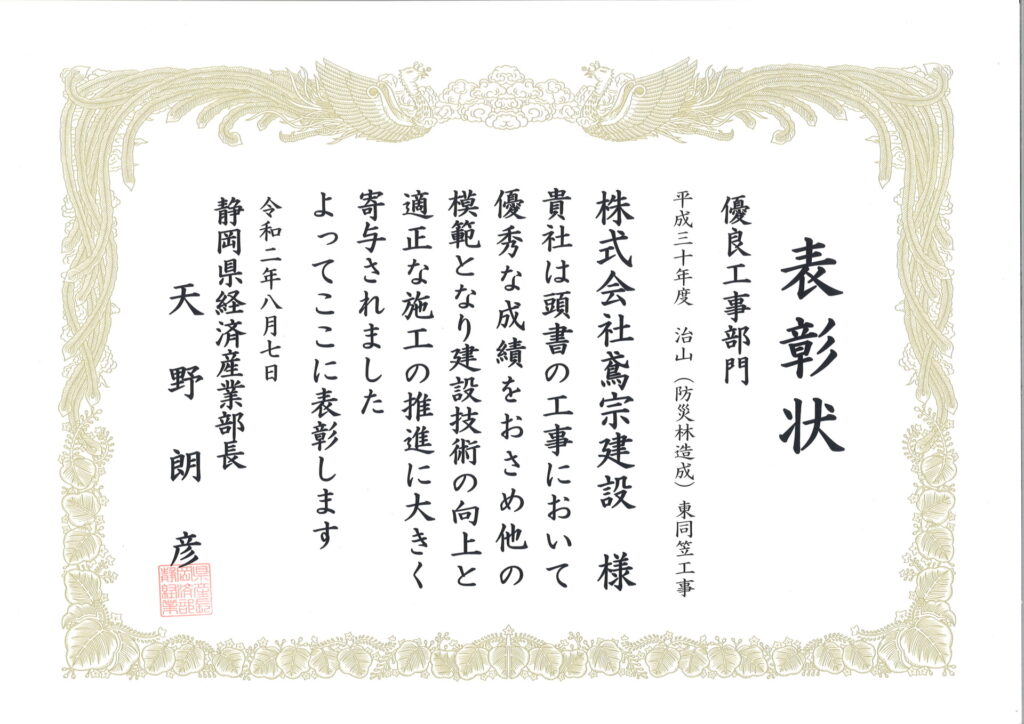 静岡県経済産業部農林水産担当部長より優良建設工事表彰…