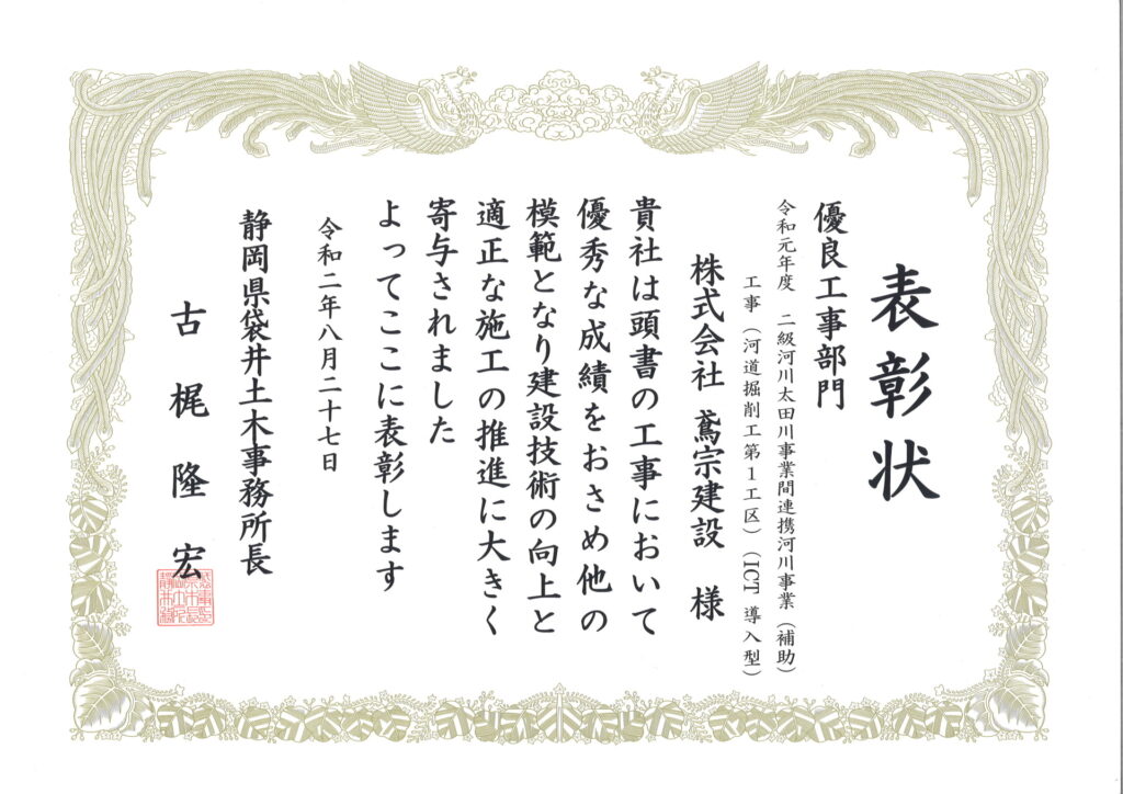 静岡県袋井土木事務所より優良建設工事表彰(優良工事)…