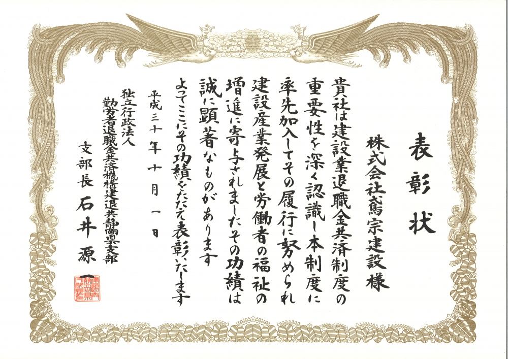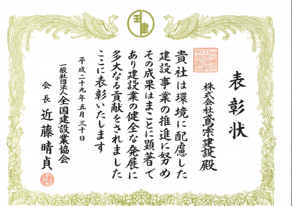 一般社団法人全国建設業協会より表彰状を頂きました