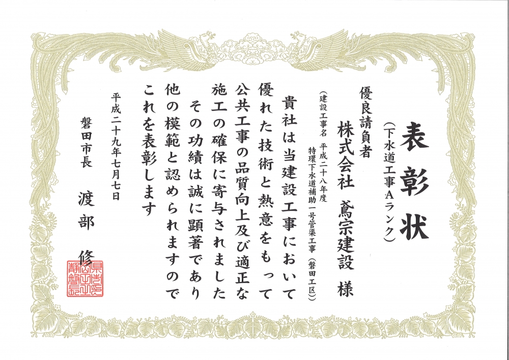 磐田市より下水道工事優良工事表彰を受賞致しました