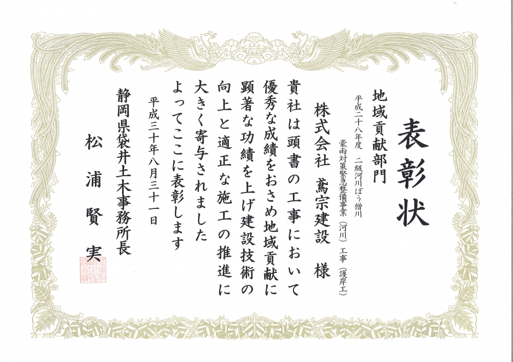 静岡県袋井土木事務所より優良建設工事表彰(地域貢献)…