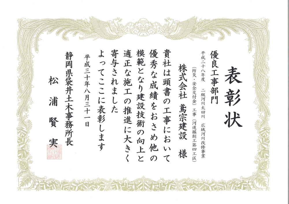 静岡県袋井土木事務所より優良建設工事表彰(優良工事)…