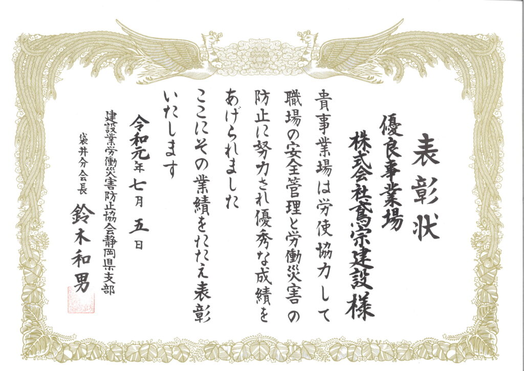 建設業労働災害防止協会静岡県支部より表彰状を頂きまし…