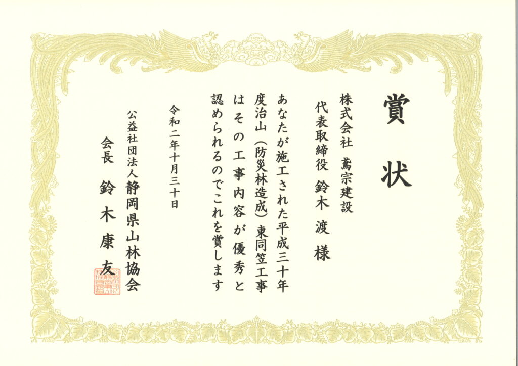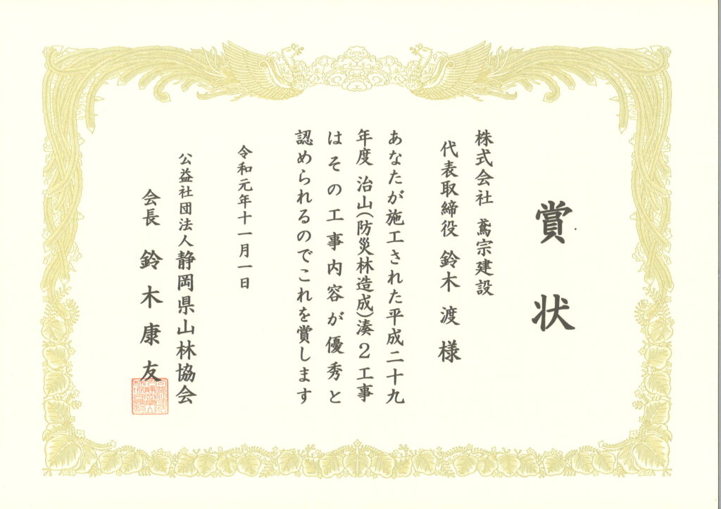 公益社団法人静岡県山林協会より賞状を頂きました