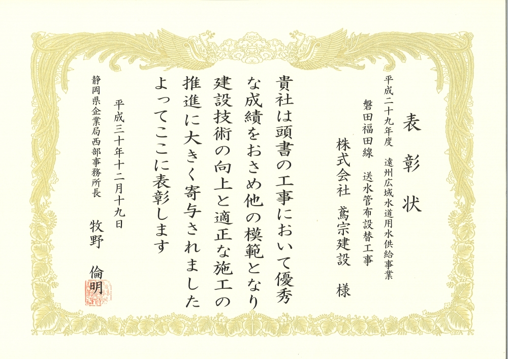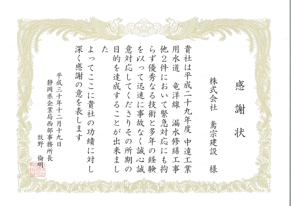 静岡県企業局西部事務所より感謝状を頂きました