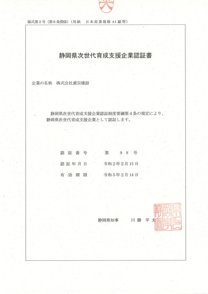 静岡県次世代育成支援企業の認証を更新しました