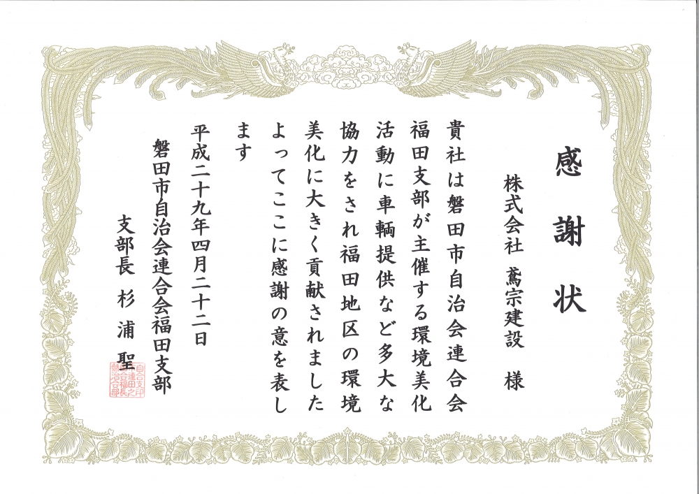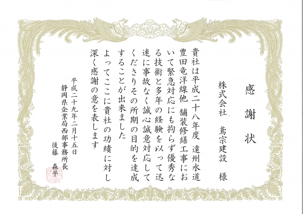 静岡県企業局西部事務所より感謝状を頂きました