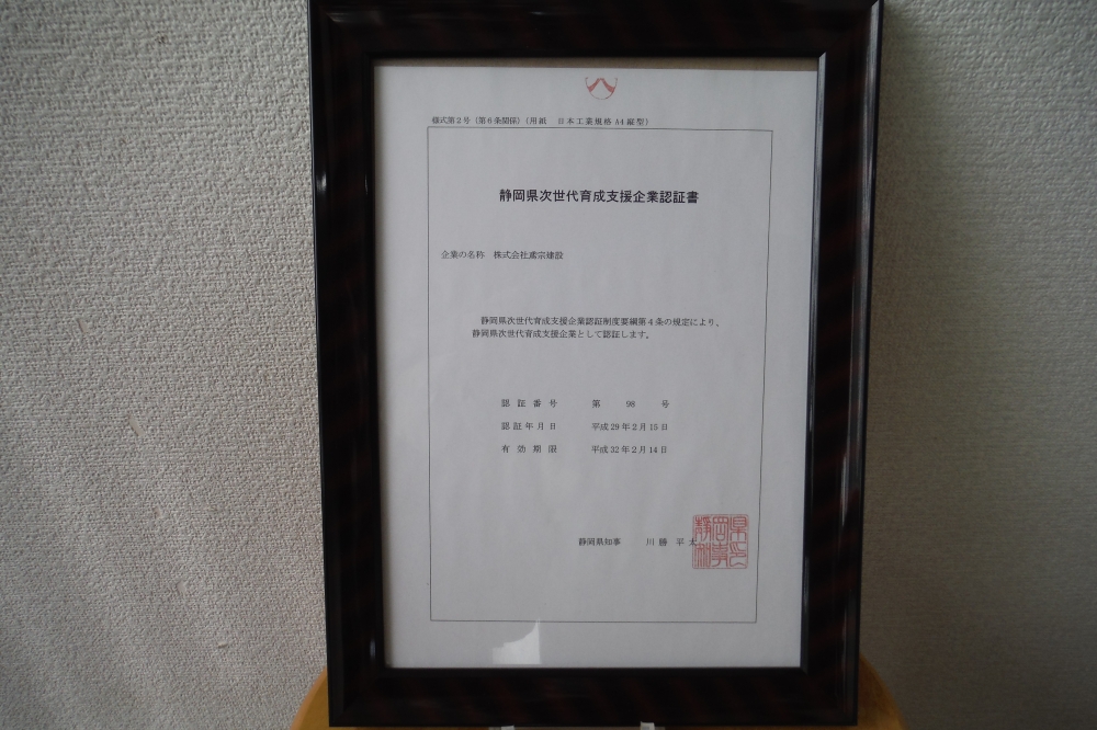 静岡県次世代育成支援企業に認証を受けました