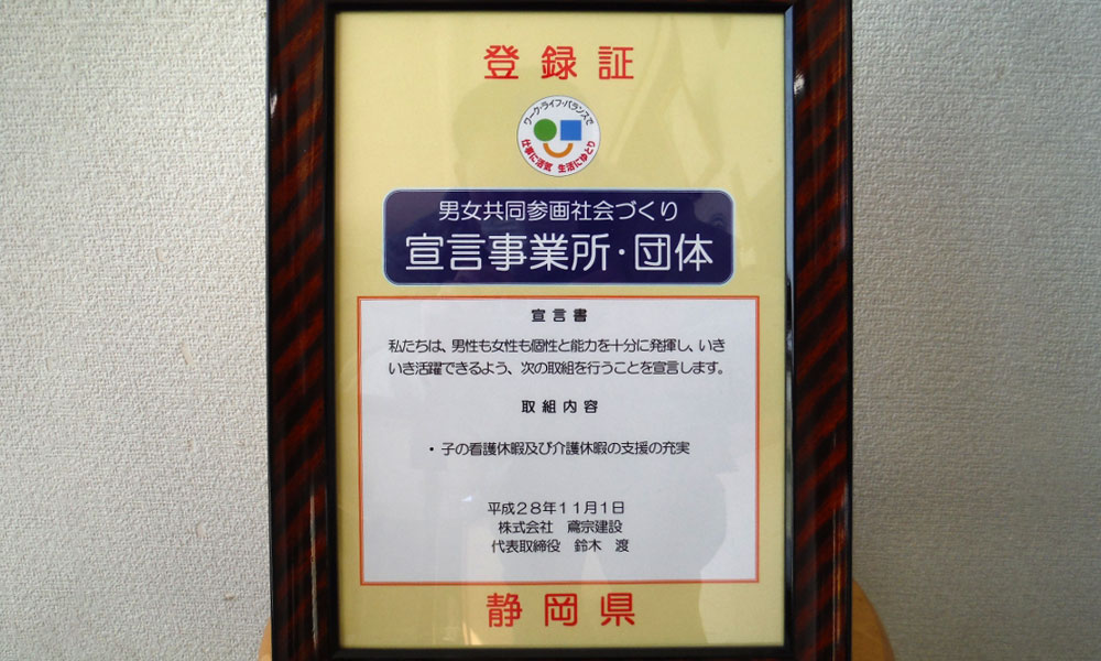 男女共同参画社会づくり宣言事業所の登録を致しました